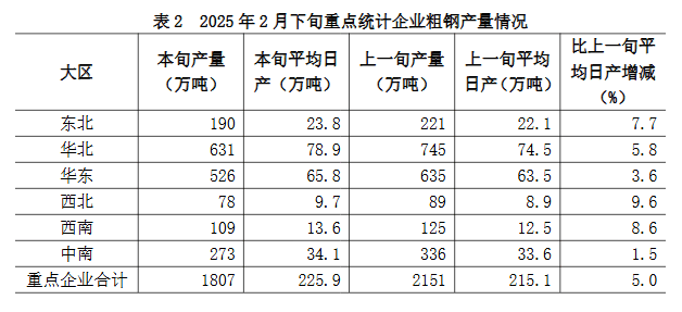 2025年2月下旬,重點統(tǒng)計鋼鐵企業(yè)共生產(chǎn)粗鋼1807萬噸,平均日產(chǎn)225.9萬噸,日產(chǎn)環(huán)比增長5.0%;生鐵1589萬噸,平均日產(chǎn)198.6萬噸,日產(chǎn)環(huán)比增長4.1%;鋼材1841萬噸,平均日產(chǎn)230.1萬噸,日產(chǎn)環(huán)比增長13.0%(見表1)1。