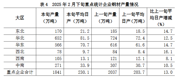 2月下旬六大地區(qū)重點統(tǒng)計企業(yè)鋼材日產(chǎn)量較上一旬均有不同程度增長(詳見表4),具體為: